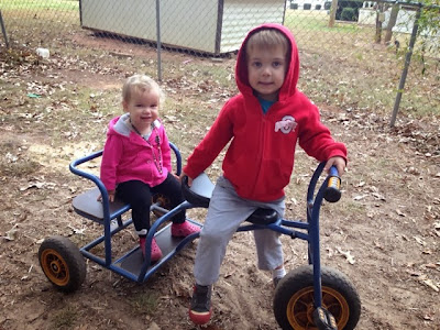 On Halloween day, James had his first teacher/parent conference (which went wonderfully - both his teachers think he is very smart and has a kind, gentle, quiet soul - I totally agree with the smart part but I am still trying to wrap my head around the quiet part of their assessment). I arranged with one of my friends to meet there and we could switch off watching each other's kids in the playground while we had our meeting so we didn't have to arrange for babysitters. After both of our meetings we over, we let the kids play for awhile and even packed lunches so we could eat there. We were getting ready to go and James was pulling Madeleine on a bike with a cart attached. She loves it and they have done this countless times before. This time, another kid comes by and accidentally bumps the back of the cart and sends Madeleine flying. She ends up getting her hand stuck and dragged on the concrete and most of the skin on her palm and thumb get totally taken off. It was the most blood I have ever seen. Awful. Thank goodness the teachers were there and were able to help hold her down while we cleaned and bandaged her hand before I whisked her off to Urgent Care. My friend ended up taking James with her so I didn't have to worry about him. I took the picture below about 2 minutes before this all happened...